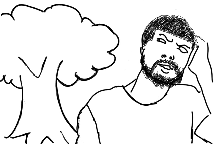 Shot 7: He seems to realize that the tree is fine and is confused.